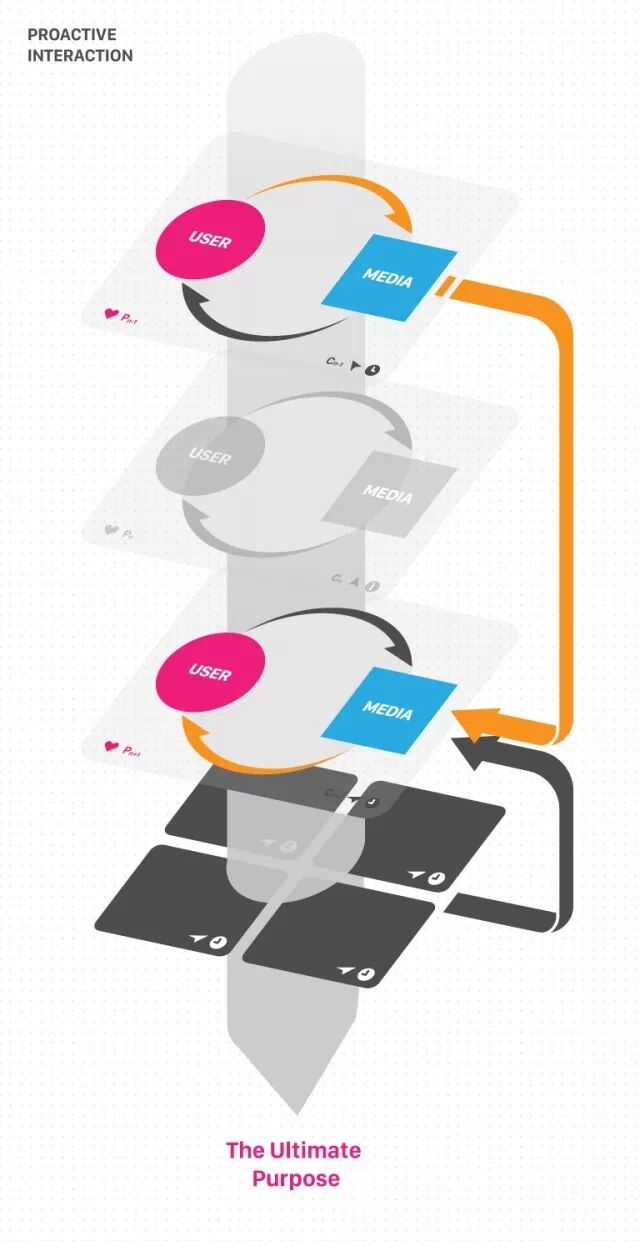 它是跨场景维度的,非线性且开放的交互设计思维,与被动响应式交互中用户主动输入、媒介被动输出的机制所不同的是,主客体I/O的交互次序发生了颠倒和置换,也就是媒介提前向用户提供了需求输出,预判甚至创造了用户下一步可能的需求和行为,且媒介的输出源(Source of output ),往往不是用户当前场景的行为输入,(1)可能是用户在先前场景中(甚至另一个场景)的间接行为输入,(2)更有可能不是来自于用户的行为输入,而是采集于某个场景、某个环境、某个其他用户等其他元素的变量输入,不管是哪种,有趣的是,这个提前出现的需求输出通常会在下一个时间点或场景出现的时候,提前帮用户达成那个场景下的目的。我们将这种交互机制称为“主动前摄性的交互方式”(Proactive Interaction),如下图所示。
