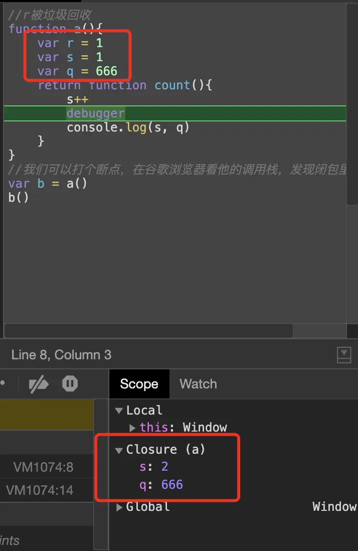 //我们可以打个断点,在谷歌浏览器看他的调用栈,发现闭包closure里面没有r了