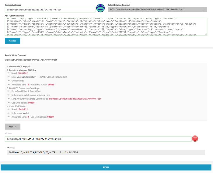 我们先来看下如何验证「映射是否成功?」,打开https://www.myetherwallet.com/页面,点击 Contract,下拉菜单选择EOS:Contribution 0xd0a6E...7ccf,点击 Access按钮,再选择keys下拉菜单,在 address栏填入你的ETH地址,点击READ,就可以查看你的映射情况,如下图所示,说明是映射过了的。