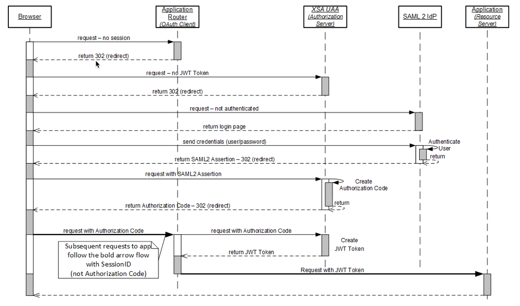 整个认证的流程是是SCP App Router和SCP UAA协同完成的,SCP UAA是SAP对Cloud Foundry上提供的安全组件UAA (User Account and Authentication Service)的一个封装,Cloud Foundry UAA是一个实现了标准Oauth 2.0协议的authorization server,SAP在此基础上做了一些自定义的增强,但是在接口上和原生的UAA保持了一致,这样可以尽可能的对OAuth Client端程序提供兼容性。