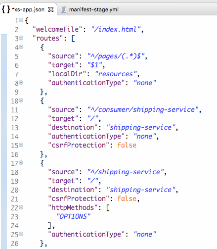 authenticationType: 有三种选择,xsuaa, none和basic,xsuaa和none分别代表了是否对当前请求在App Router上做用户安全认证,下一节会具体介绍。Basic是和SAP HANA集成的时候提供默认的安全验证支持。
