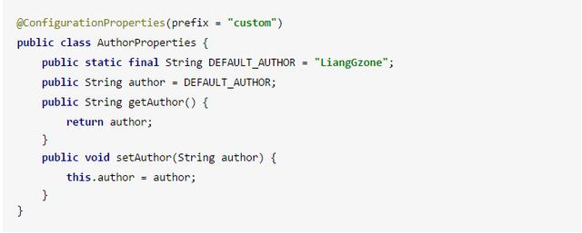 首先,我们定义一个自定义前缀,叫做 custom 吧。之前说到,这里的配置参数,可以通过 application.properties 中直接设置。那么,我们创建一个作者的字段,设置默认值为 LiangGzone。