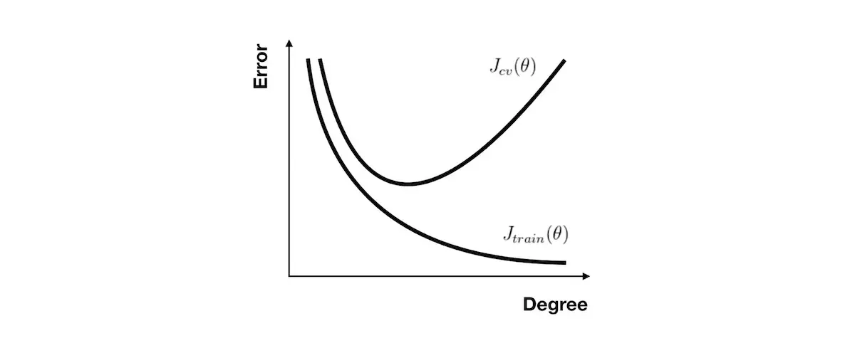 对于 多项式回归,当次数选取较低时,我们的 训练集误差 和 交叉验证集误差 都会很大;当次数选择刚好时,训练集误差 和 交叉验证集误差 都很小;当次数过大时会产生过拟合,虽然 训练集误差 很小,但 交叉验证集误差 会很大( 关系图如下 )。