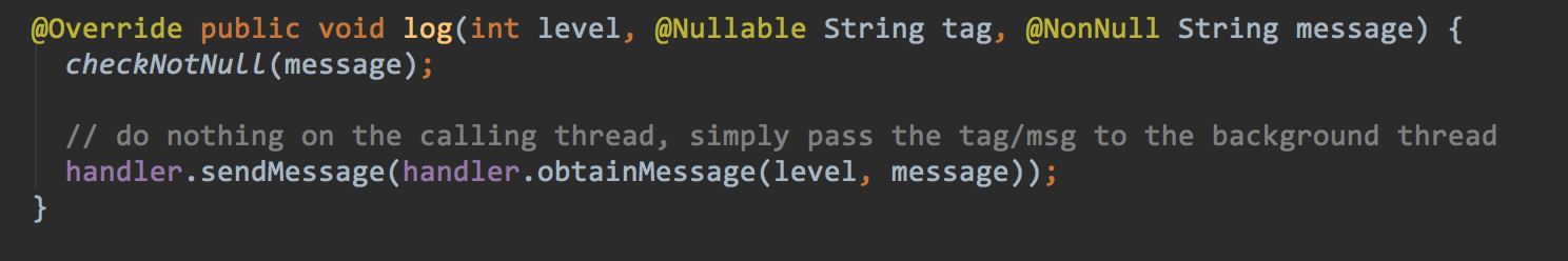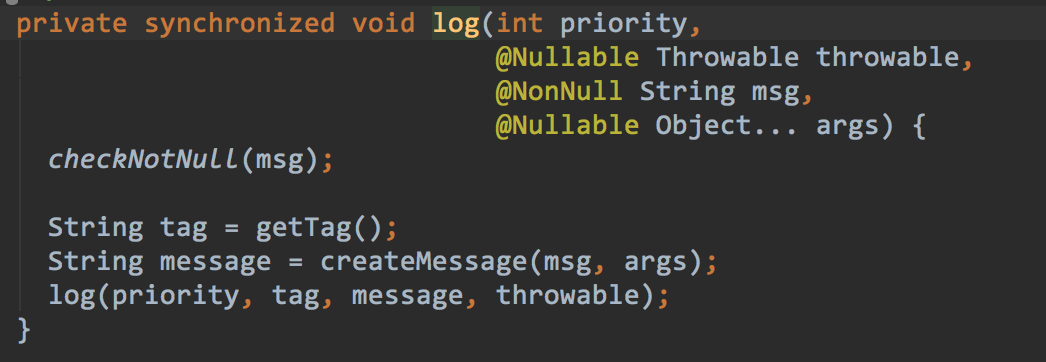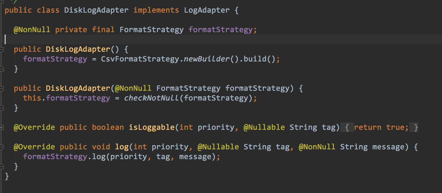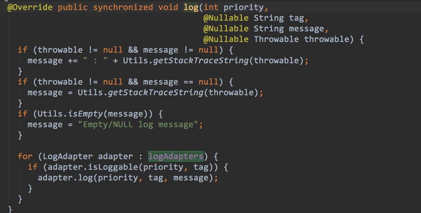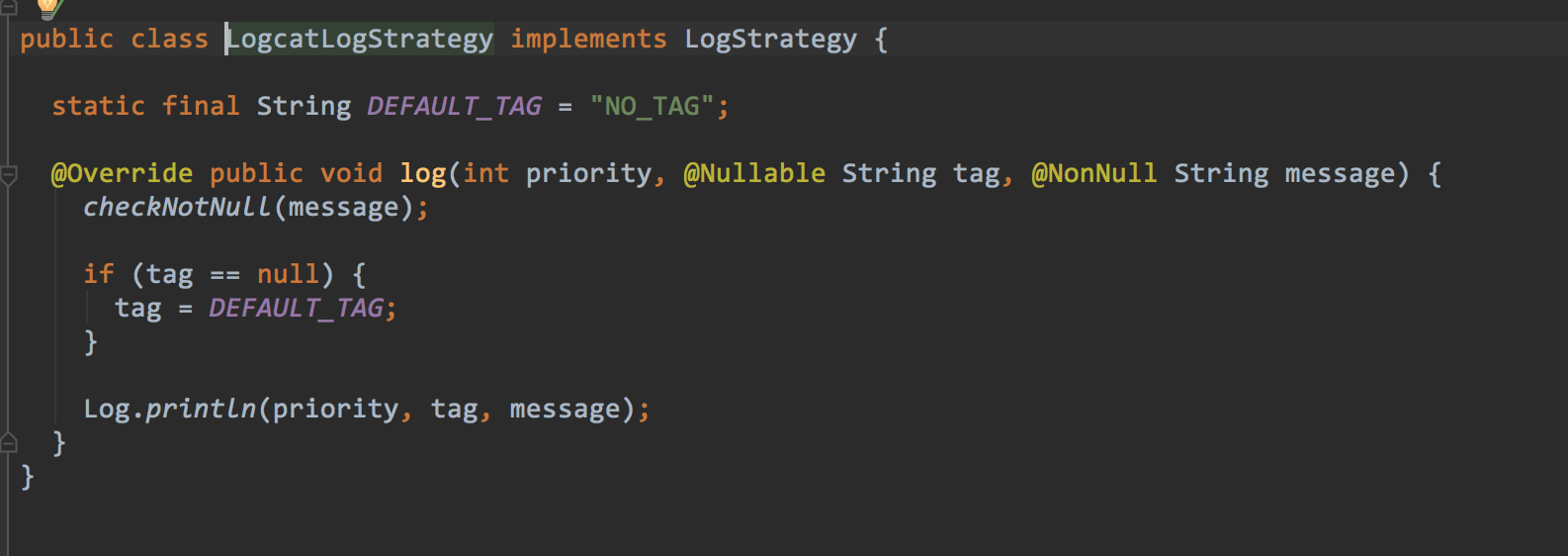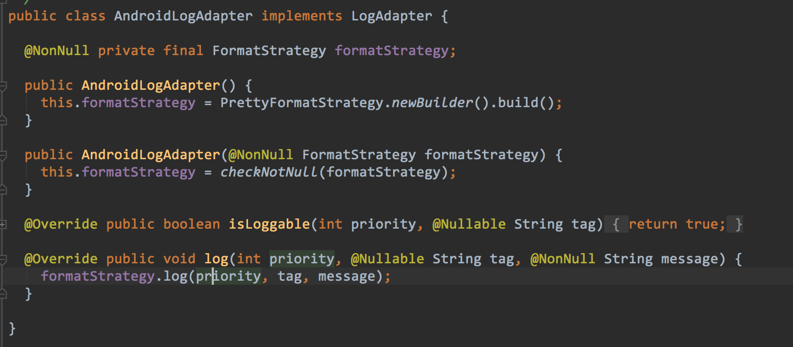 以 AndroidLogAdapter 为例,指向 AndroidLogAdapter 的 log() 方法, 最终使用系统 Log.println() 输出日志。