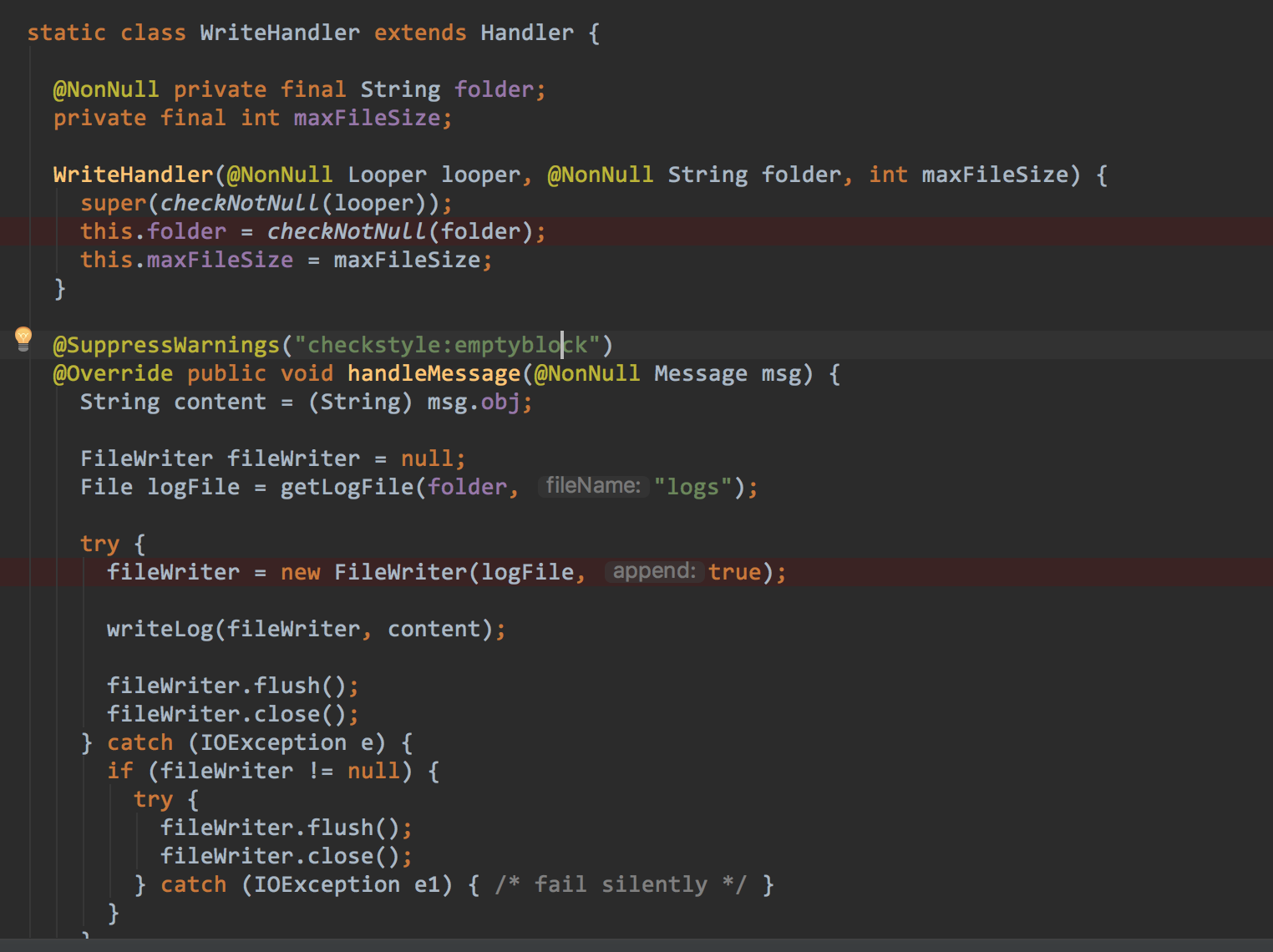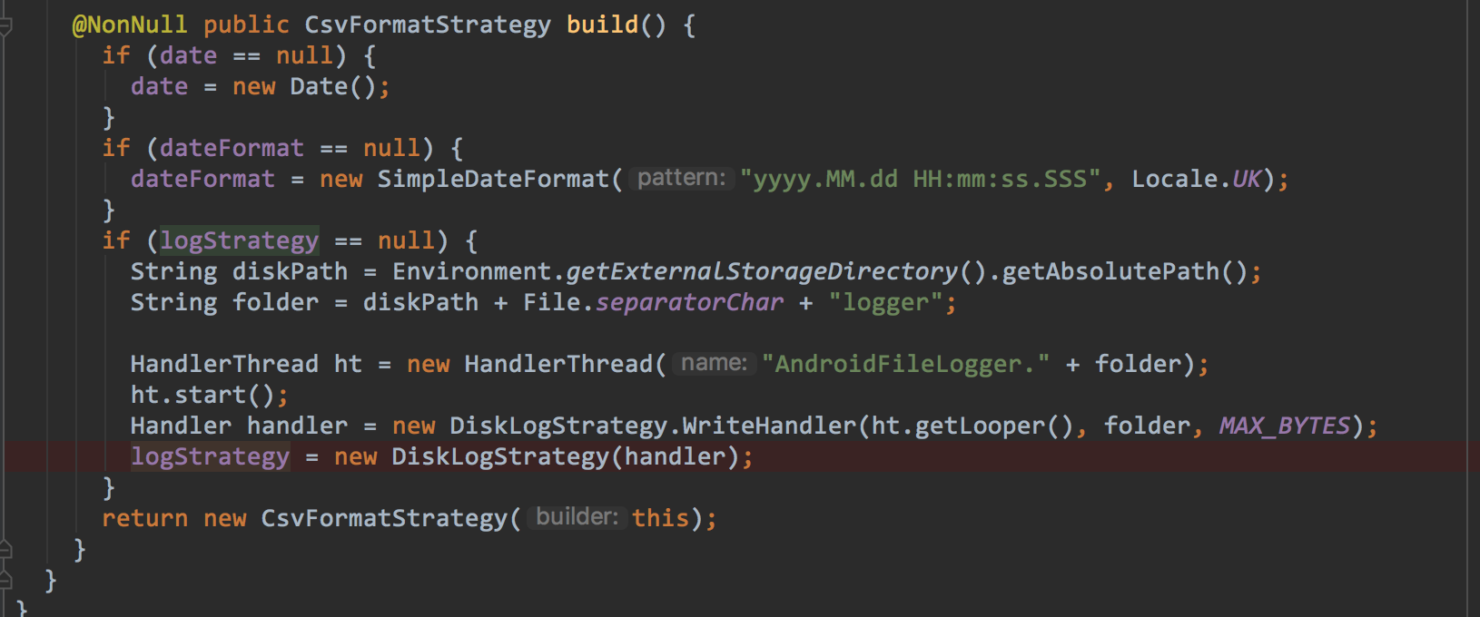 通过 new DiskLogAdapter(), 在其构造方法中 CsvFormatStrategy 使用 Builder 模式 创建了一个 CsvFormatStrategy 实例, 在 builder() 可以看到具体的路径,因为一旦在子线程中操作,Handler 需要手动启动 Looper, 所以这里 通过 HandlerThread 获取 Looper 传递给 Handler, 通过 DiskLogStrategy.WriteHandler 创建 Handler, 将将文件路径传递给 DiskLogStrategy.WriteHandler, 同时通过构造方法生成 DiskLogStrategy 对象,将 handler 传递给 DiskLogStrategy, 当输出 Log 时调用 DiskLogStrategy 的 log() 方法,通过 log() 方法中 handler 将 message 发送出去, 然后交给 handler 处理,存储到 DiskLogStrategy.WriteHandler 中的路径。