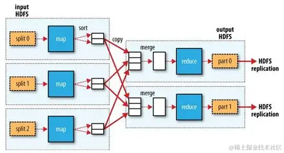 6,图中reduce Task中进行了好多merge合并,这期间也产生了好多磁盘的io,最终output出去,可以使HDFS,也可以是数据库,也可以是本地文件等等