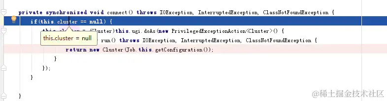 这里写的很清楚,就是从配置文件中获取mapreduce.framework.name,配置文件中配置了这个是yarn,这个cluster就是yarn的RPC的客户端,通过cluster远程调用yarn的server的相关方法。hadoop中大量使用了RPC这也是分布式中必须要使用到的