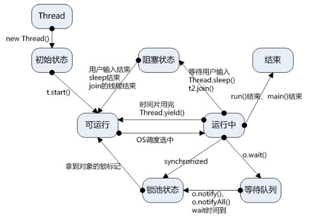 对于线程来说,一共有五种状态,分别为:初始状态(New) 、就绪状态(Runnable) 、运行状态(Running) 、阻塞状态(Blocked) 和死亡状态(Dead) 。