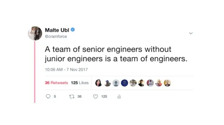 我还想说另外一点,即从职业生涯的角度来给出一些我的思考。我想我们当中很多人都会立志成为一名高级工程师。或许还在奋斗的路上,但我们的目标是达到那样的水平。在我看来,高级一词意味着我有能力解决别人抛来的几乎所有问题,我掌握开发工具的用法,我了解所在领域的动态。而另一个很重要的部分在于我能够让初级工程师最终成为高级工程师。