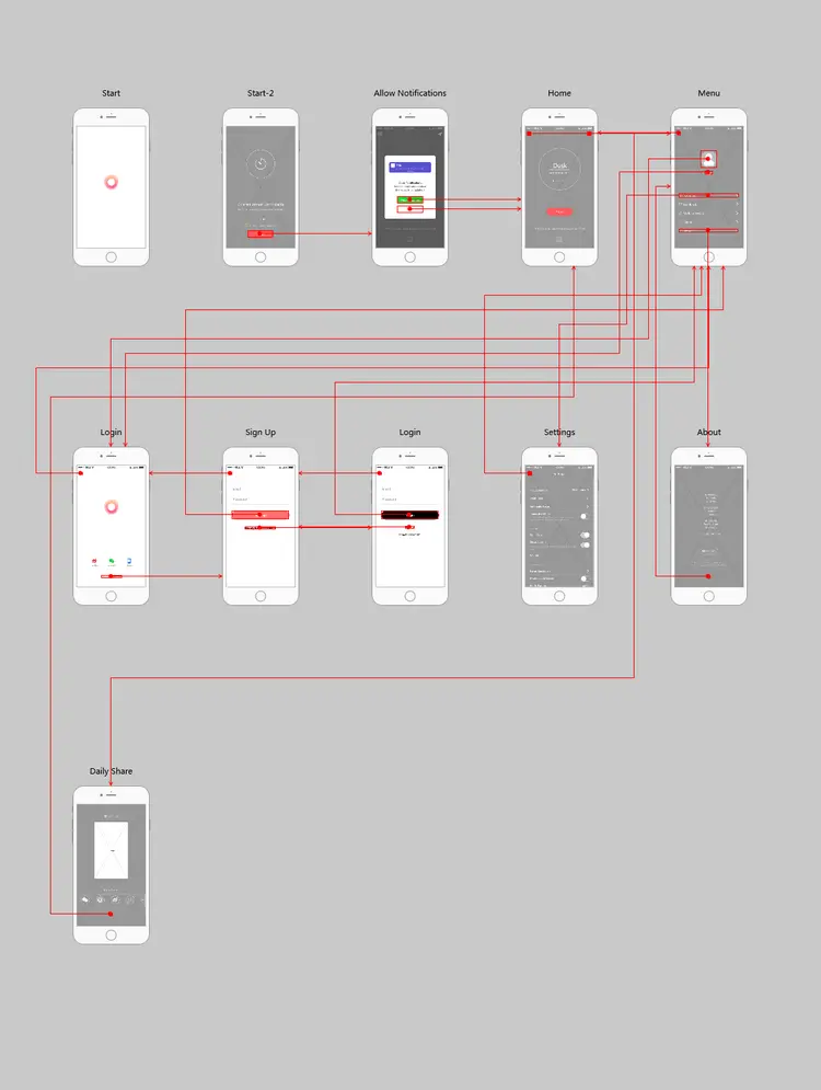 这个原型的主要页面有:启动页面、主页、登录注册页面、分享页面、设置页面等。