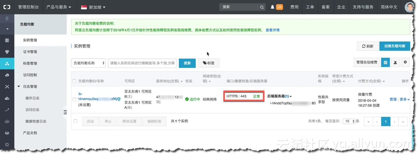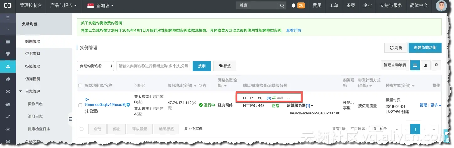 可以看到上该实例上多了一个80监听,一个蓝色的(R)标识该监听被重定向到443端口,意味着从HTTP:80端口进来的访问都会被重定向至HTTPS:443。