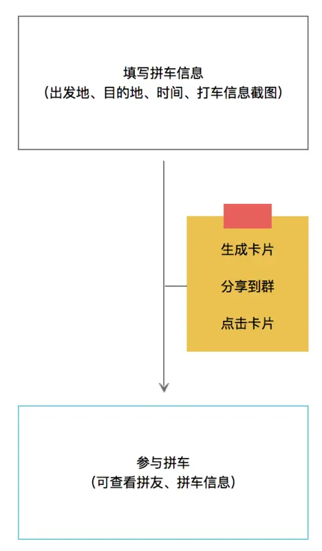 发起拼车的人把出发地点、目的地点、打车信息以卡片的形式分享出来,参与拼车的人点击卡片就能选择参加拼车,并且能看到同车拼友是谁,拼单的信息等等内容。