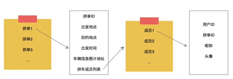 由于时间仓促,功能又简单,所以并没有考虑任何高并发等复杂场景,仅仅考虑功能的实现。从需求的逻辑可以知道,其实后台只需要维护两个列表,分别存储当前所有拼车单以及当前所有参与了拼车的用户即可,其数据结构如下: