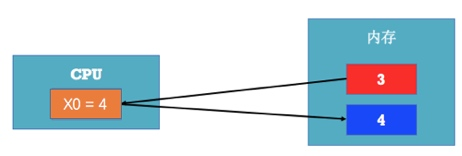 - CPU首先会将红色内存空间的值放到X0寄存器中:mov X0,红色内存空间