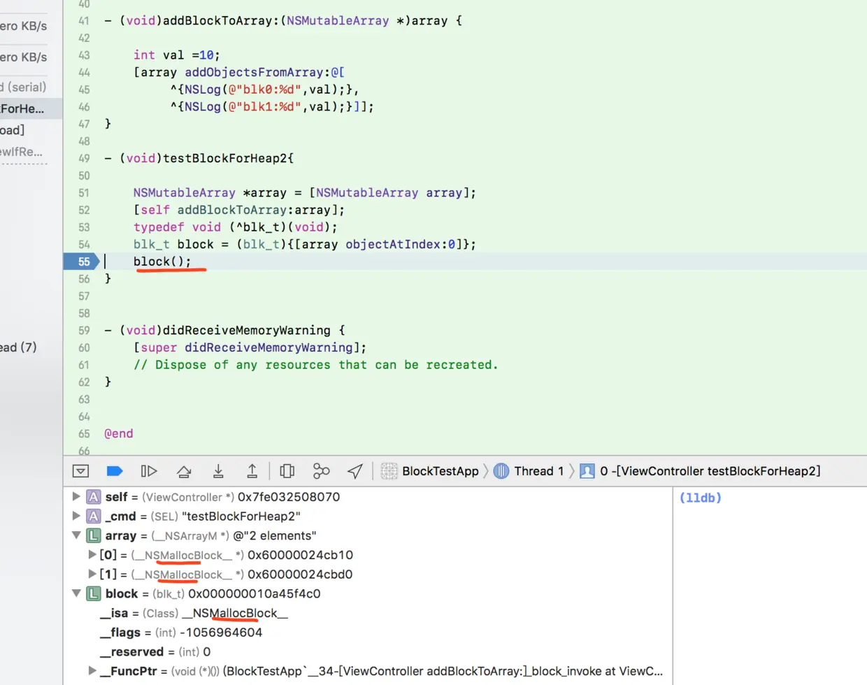 例如下面代码中,在addBlockToArray方法中的block还是_NSConcreteStackBlock类型的,在testBlockForHeap2方法中就被复制到了堆中,成为_NSConcreteMallocBlock类型的block: