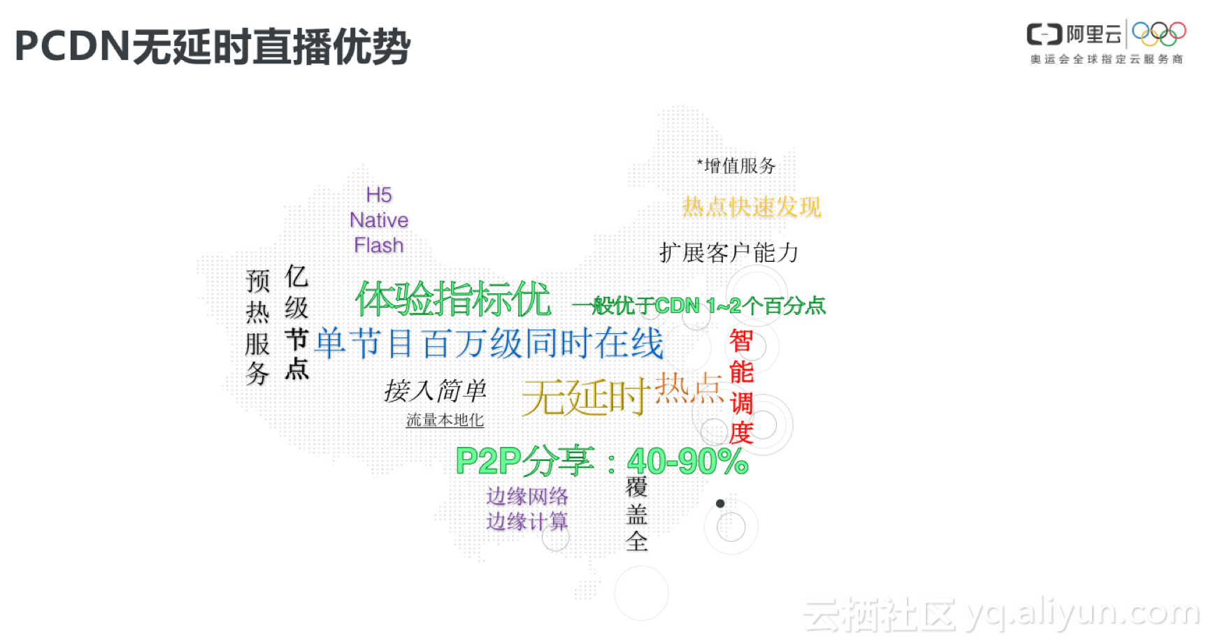 PCDN对直播的支持有非常明显的优势,首先,在调度端,阿里云有管理亿级节点的能力,通过资源优选,可以为消费点分配最适合他的节点。同时,在端上有很多算法,比如说像子流化、分片化的算法,还有多点多径的连接都可以更好的支持直播,单节目可以支持百万级的同时在线。