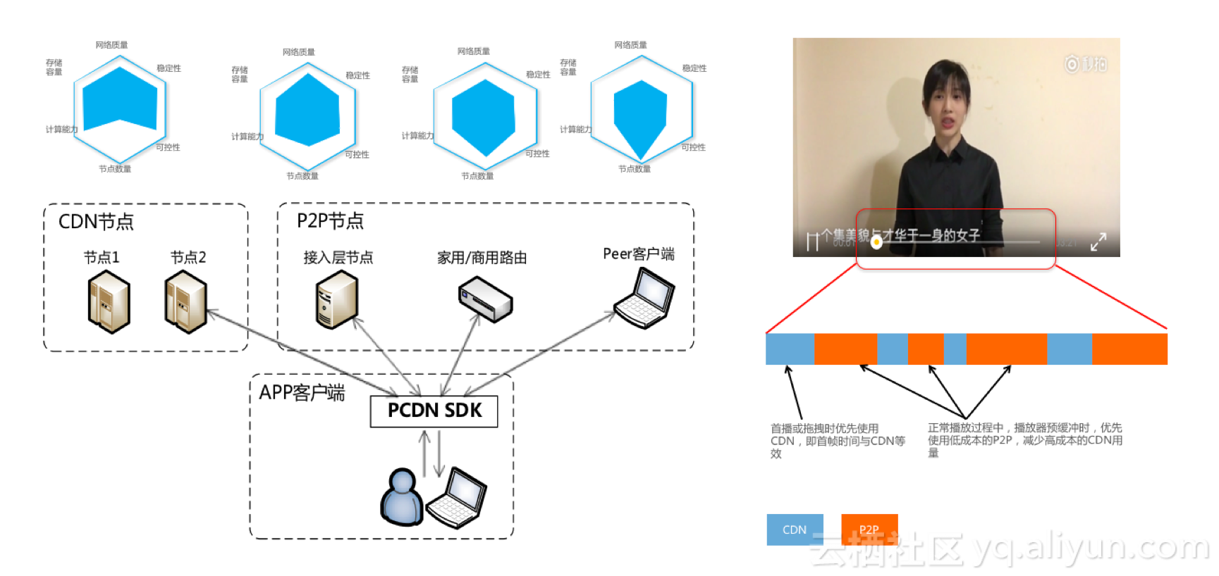 其实P2P还有一个点,我们选择这么多特点各异的节点,它在成本上区别是非常之大的。利用这些特点,通过我们的调度算法和连接服务,最终我们可以达到很高的分享率,同时因为节点非常靠近用户,和用户的距离非常近,PCDN在直播延时方面接近零延时。
