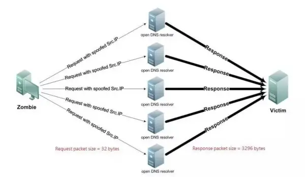 同时,DNS 大部分使用 UDP 协议,UDP 协议没有握手过程让其去验证请求的源 IP。如下图所示,攻击者(实际上是攻击者控制的傀儡机)发送大量伪造了 Victim IP 的请求给 DNS 服务器,DNS 服务器成为放大器将 DNS 响应回复给受害者。
