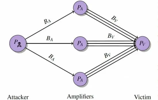 如下图所示,这里的攻击者(Attacker,实际情况中更多的会利用傀儡机进行攻击)不直接把攻击包发给受害者,而是冒充受害者给放大器(Amplifiers)发包,然后通过放大器再反射给受害者。
