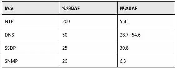 这里我们引入一个学术名词,带宽放大因子(BAF, Bandwidth Amplification Factor),它表示的是请求报文与响应报文的比例。对于各种协议的反射放大攻击,由于其不同版本的实现机制各不相同,加上对请求数据支持的多样性,同一服务的 BAF 值也会存有一定的差异,我们通过实验对比了各种协议的实验 BAF,可以让大家直观感受各种反射攻击的威力,了解攻击放大的倍数。