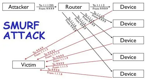 Smurf 攻击是经典的 DDoS 攻击,Smurf 攻击是以最初发动这种攻击的程序名 Smurf 来命名。这种攻击方法结合使用了 IP 欺骗和 ICMP 回复方法使大量网络传输充斥目标系统,引起目标系统拒绝为正常系统进行服务。