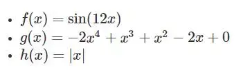 方法:我们将在 50 个数据点 (x,y) 上训练一个 1 层神经网络,这些数据点从域 [-1,1] 上的以下函数中绘制,所得拟合的均方误差(mean square error,MSE)。我们将尝试以下函数(你可随时通过更改以下代码来尝试自己的函数。):