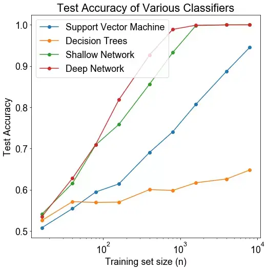 假设: 随着数据集大小的增加,所有技术方法的测试正确率都会提高,但深度模型的正确率会比非深度模型的正确率要高。我们进一步预计非深度学习技术的正确率将更快地饱和。
