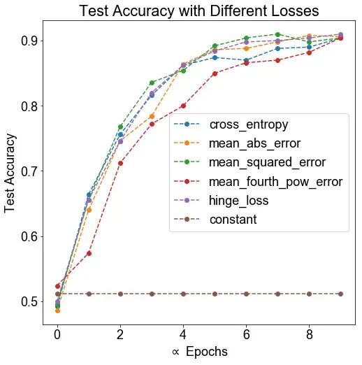 假设: 我们预计交叉熵损失函数作为分类任务的标准损失函数,表现最好,同时我们预计其他损失函数表现不佳。