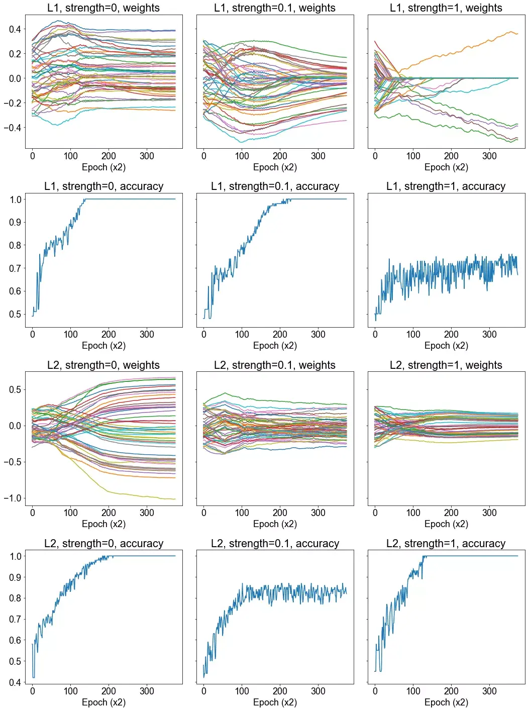 假设: 我们预计在正则化的情况下,权重的大小会降低。在 L1 正则化的情况下,我们可能会得到稀疏的权重。如果正则化强度很高,我们就会预计正确率下降,但是正确率实际上可能会随轻度正则化而上升。