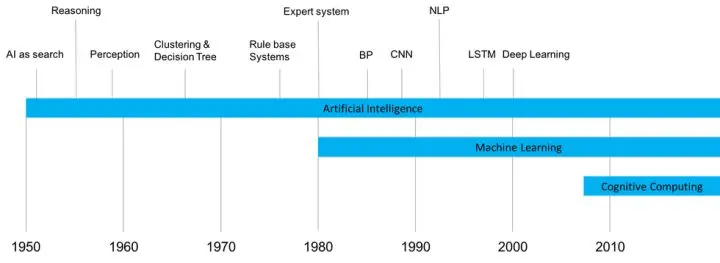 1950 年代初期,人工智能聚焦在所谓的强人工智能,希望机器可以像人一样完成任何智力任务。强人工智能的发展止步不前,导致了弱人工智能的出现,即把人工智能技术应用于更窄领域的问题。1980 年代之前,人工智能的研究一直被这两种范式分割着,两营相对。但是,1980 年左右,机器学习开始成为主流,它的目的是让计算机具备学习和构建模型的能力,从而它们可在特定领域做出预测等行为。
