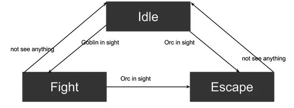 首先要说一下有限状态机(FSM),一般应用于游戏机器人,网络协议,正则表达式,词法语法分析,自动客服等。如下图是一个简单的游戏机器人状态转移和行动图。