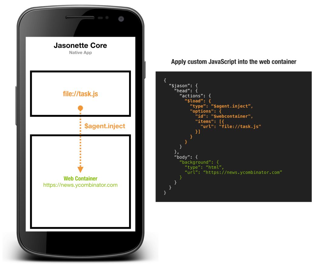 就算不需要构建 Web 浏览器,当希望为所包含的内容不由我们控制的 URL 实现自定义行为时,同样需要使用脚本注入的方法。原生应用和 Web 容器只能通过$agent API 通信,但如果无法更改 HTML 内容,只能通过动态注入的方式将 $agent接口加入 Web 容器。