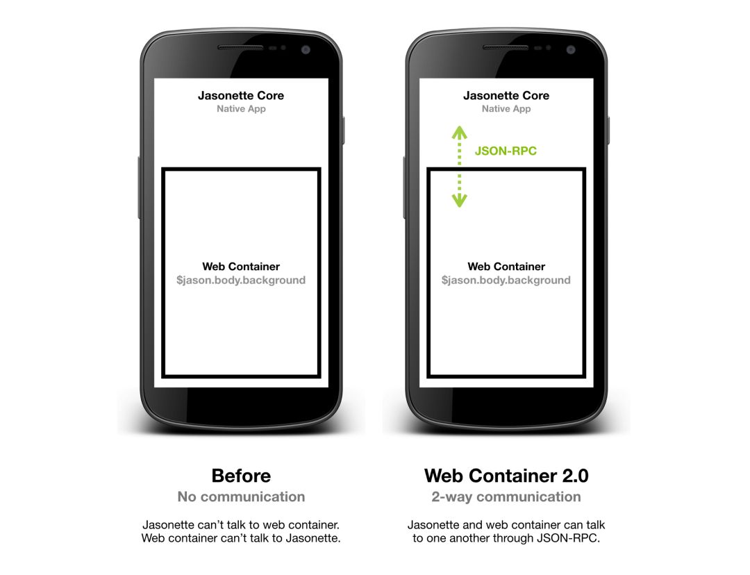 为此我在父应用和子 Web 容器之间使用了一种基于 JSON-RPC 的通信管道。由于 Jasonette 中的一切都是通过 JSON 对象表达的,因此使用 JSON-RPC 标准格式作为通信协议就成了一种非常自然合理的方式。