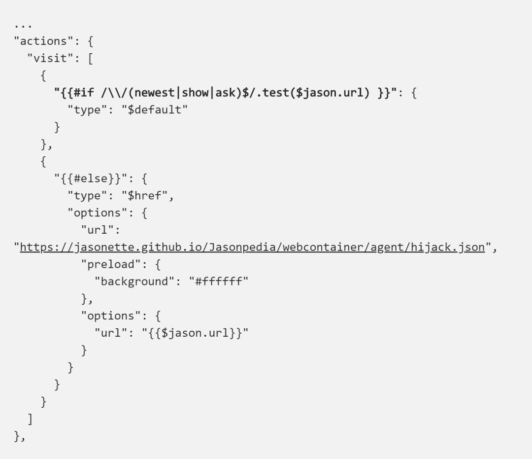 在下列代码中,我们会检查$jason.url是否与newest、 show、ask等内容(均为顶级菜单项链接)相符。如果相符,设置"type": "$default"即可让 Web 容器做出与普通浏览器一样的行为。