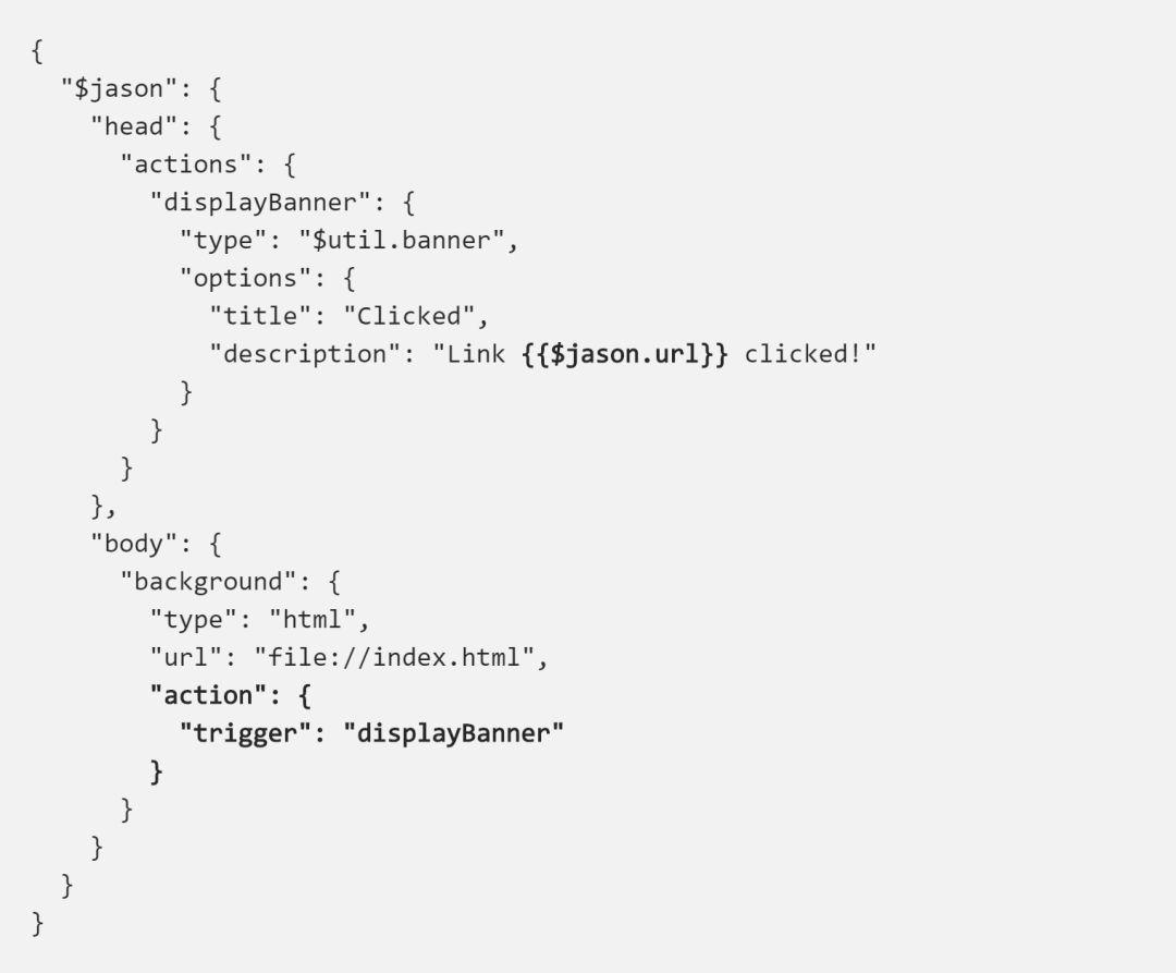 在这里我们为 Web 容器附加了"trigger": "displayBanner",这意味着当用户点击 Web 容器内的任何链接后,将触发displayBanner操作,而非直接交由 Web 视图处理。