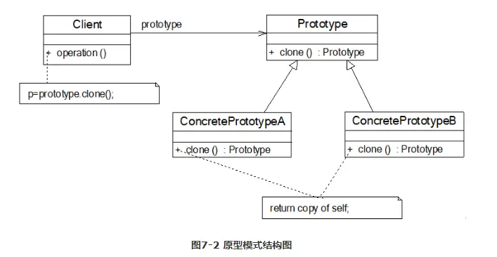 - ConcretePrototype(具体原型类):它实现在抽象原型类中声明的克隆方法,在克隆方法中返回自己的一个克隆对象。