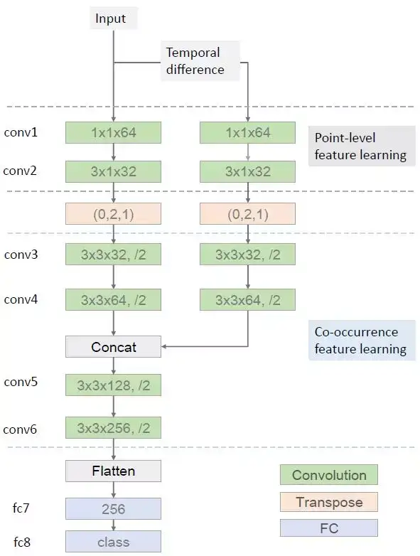 我们提出了一种端到端的共现特征学习框架,其使用了 CNN 来自动地从骨架序列中学习分层的共现特征。我们发现一个卷积层的输出是来自所有输入通道的全局响应。如果一个骨架的每个关节都被当作是一个通道,那么卷积层就可以轻松地学习所有关节的共现。更具体而言,我们将骨架序列表示成了一个形状帧×关节×3(最后一维作为通道)的张量。我们首先使用核大小为 n×1 的卷积层独立地为每个关节学习了点层面的特征。然后我们再将该卷积层的输出转置,以将关节的维度作为通道。在这个转置运算之后,后续的层分层地聚合来自所有关节的全局特征。此外,我们引入了一种双流式的框架 [Simonyan and Zisserman, 2014] 来明确地融合骨架运动特征。