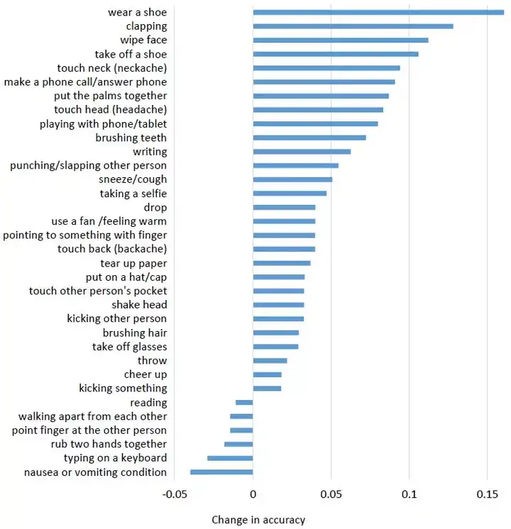 图 6:在 NTU RGB+D 数据集上的 cross-subject 设置中,在每个类别上 HCN 相对于 HCN-local 的准确度变化。为了清楚简明,这里只给出了变化超过 1% 的类别。