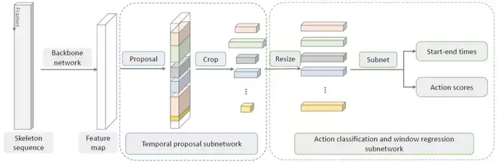 图 5:时间动作检测框架。图 3 描述了其中的骨干网络。还有两个子网络分别用于时间上提议的分割和动作分类。