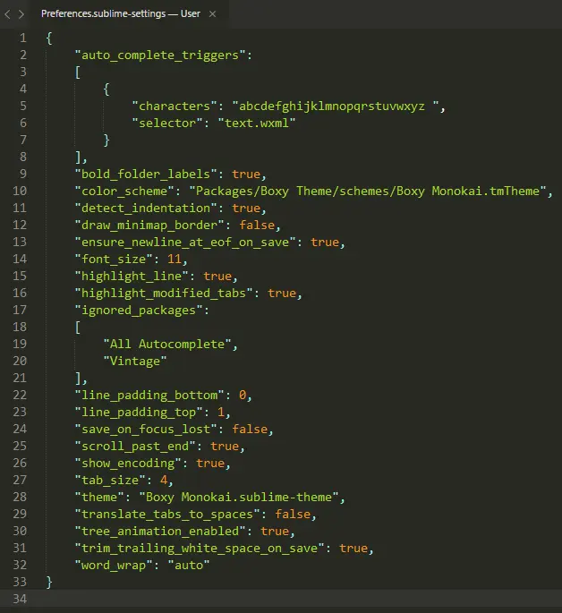 为了提高wxml的补全效率,需要选择菜单(Preferences > Settings),在打开的Preferences.sublime-settings用户配置文件中加入下面的代码: