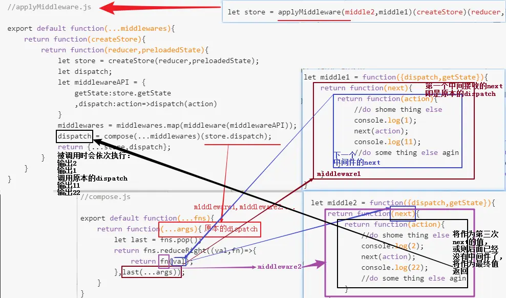 let store = applyMiddleware(middle2,middle1)(createStore)(reducer);