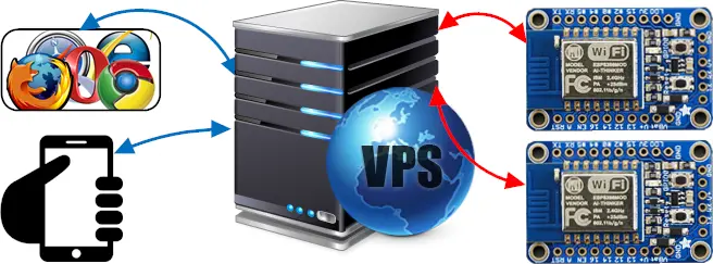 除了设置你的VPS之外,我还会告诉你如何安装一些简单的实例来通过浏览器来实现对LED、灯管的控制。下面的图示展示了如何通过浏览器定向至你自己的VPS并实现对不同设备的实时控制。在这里在线的VPS充当了代理的功能,这使得不同的用户可以通过浏览器来控制相应的设备。