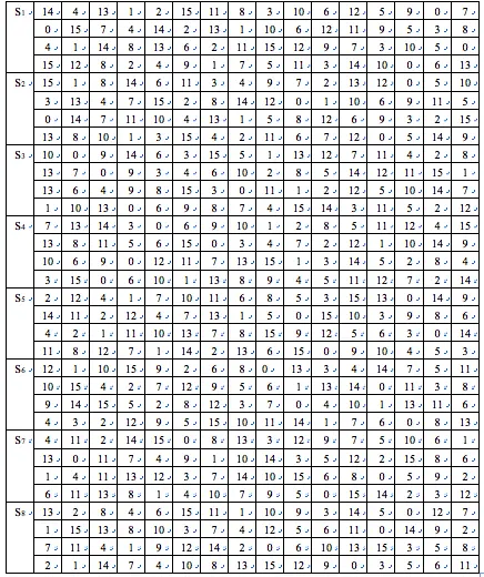 S-盒是DES算法的核心,它的功能是将6位数据变为4位数据,它是一个选择函数,共有8个S函数,其功能表如表1.5所示。