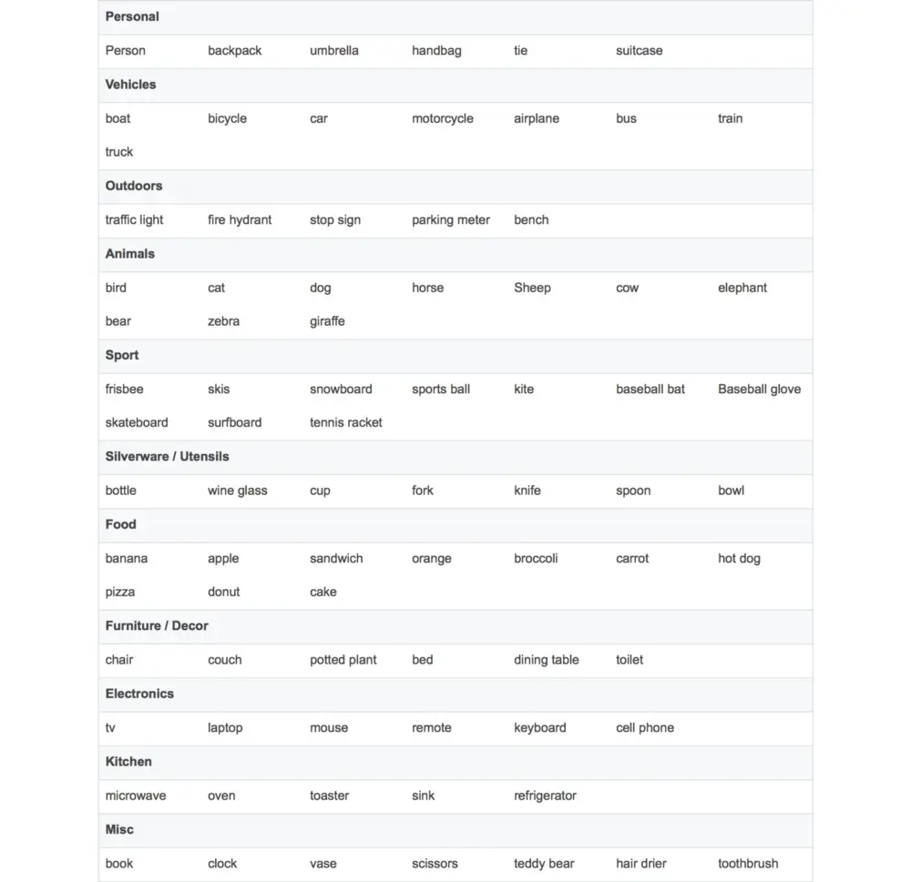 为了让大家方便一些,我(作者 Nick Bourdakos——译者注)做了一个列表,将用 COCO 模型可以检测出的物体放在了一起: