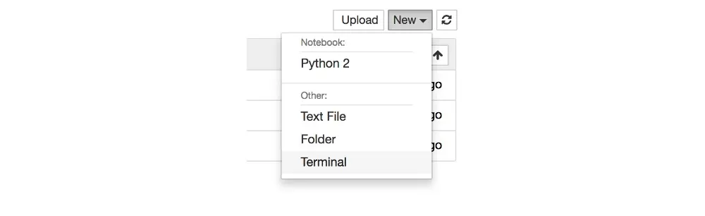 点击 New 下拉菜单,选择 Terminal,得到一个新的终端窗口: