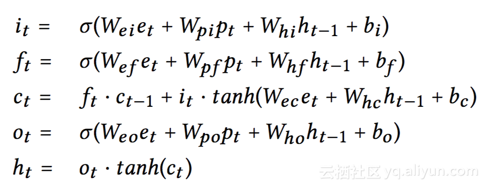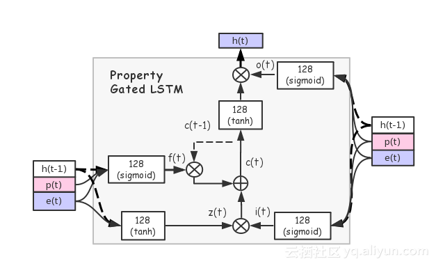 上图中,p表示property,e表示embedding,h(t-1)表示前一个LSTM的输出,h(t)表示当前LSTM的输出。具体的Property Gated LSTM公式如下所示: