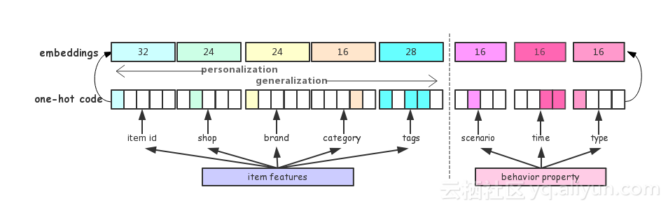 Embedding层主要将用户的行为转化为向量。如上述所说,用户的一个行为由行为描述(behavior property)和商品特征(item features)组成。商品特征包括商品ID、所属店铺、品牌、所属类目(例如服饰箱包)等信息,此外商品还会有一些更加泛化的标签,例如商品价格是否昂贵,商品颜色是什么,风格是韩版还是欧美风等等。上图中对商品的描述信息从左向右越来越泛化。这里认为,越泛化越个性化特征能更综合地表示商品信息,例如若某个商品非常热销,那么该商品ID就能表示它,但当商品销量特别低时,商品ID就无法表示它,还需要该商品的所属店铺、品牌、所属类目以及更个性化的便签。用户的行为描述包括三方面:一是行为场景,例如行为是发生在搜索时、推荐时或者在聚划算时;二是行为时间,可以是一分钟以内、五分钟以内或是半小时以内,淘宝对行为时间进行了分窗口划档,将行为按照行为时间分至不同的档位;三是事件类型,分为成交、点击、加购物车、收藏。向量转化后的维度可以从上图中得知,商品特征的五种属性维度分别是32、24、24、16、28,行为描述的三个属性维度为16、16、16。最后将所有的向量组合,得到最终的用户行为向量。