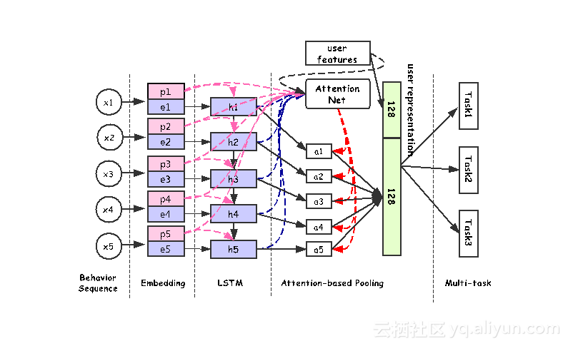 模型的输入信息是用户在淘宝上的行为序列。每个行为包括两部分:第一部分是行为动作,例如行为类型可能为点击、搜索以及推荐等,行为时间可能为1分钟前、五分钟前或半小时前,这些属性是用户的动作本身而与商品无关;第二部分是与商品相关的部分。这里每个行为x被表达成一个性质描述p(property)和e(embedding)。然后建立LSTM(Long Short-Term Memory)将用户行为序列串接起来。接下来使用attention net做池化(pooling)得到一个128维向量的用户表达。将该向量和用户的其他信息组合,得到最终的可以被多个任务共享学习的用户表达。综上所述,该多任务模型可以分为五层:输入层Behavior Sequence, Embedding层,LSTM层,Attention-based Pooling层,Multi-task接收输出层。其中涉及的技术包括: