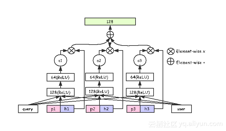 在LSTM网络之后,淘宝也仿照自然语言处理,加入了attention net机制,其作用和门比较类似,也可以决定行为的重要性程度。但与门有所区别的是,门在处理行为重要性时只能根据当前行为的信息来决定,attention net机制中可以加入一些额外的信息,例如可以加入用户query信息和user信息,user会包含用户年龄、性别、购买力、购买偏好等信息,query会包含自身的ID、分词以及一些内幕信息等。具体如下图所示: