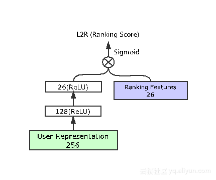 任务二是L2R(Learning to Rank,也可做LTR)任务,形式上与CTR预估类似,但不同的是输入信息中需要包含具体的商品排序特征(Ranking Features)。在CTR预估中将用户表达与embedding做全连接操作,而L2R任务中是将用户表达经过两层网络后和商品特征进行线性相乘。它的优势是最上一层网络容易理解,并且便于查错。而公式中与CTR不同的是加入了权重信息,来表示注重或者忽略哪些行为。比如用户点击商品、购买商品的行为需要较大的权重,而浏览商品后无任何行为可以予以忽视。